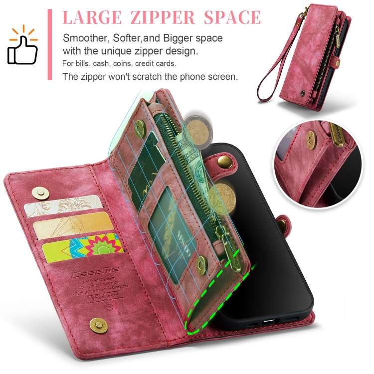 Estuche para iPhone Xs Max Caseme Cuero Tapa Horizontal Multifuncional Desmontable Ranura Tarjeta Soporte Billetera Cremallera Marco Fotos (Rojo)
