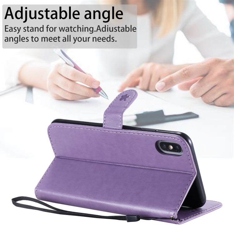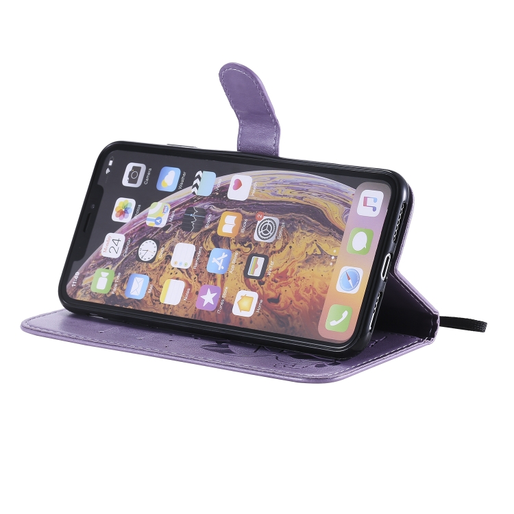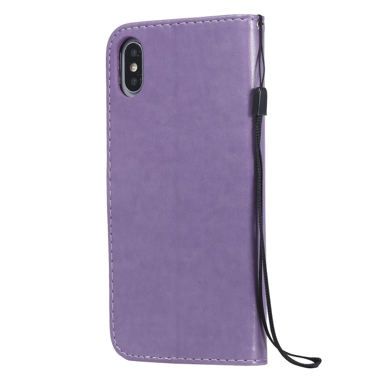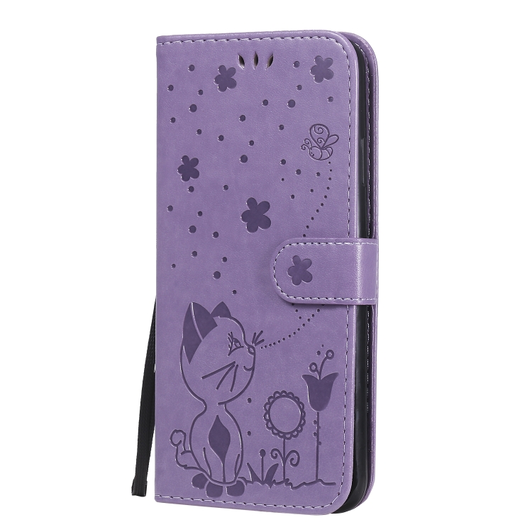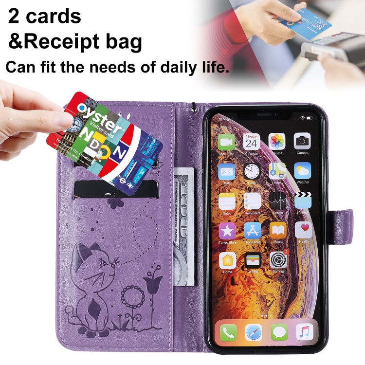Funda de cuero iPhone Xs Max Cat Bee patrón en relieve tapa horizontal soporte y ranuras para tarjetas (Púrpura)