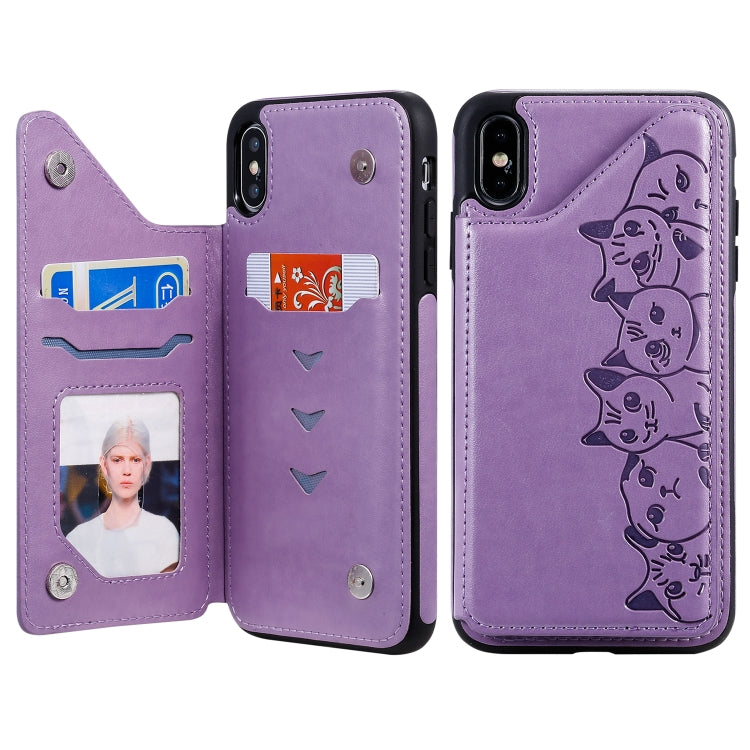 Estuche Protector Six Cats para iPhone Xs Max con Patrón de Relieve Soporte Ranuras Tarjetas y Marco de Fotos (Púrpura)