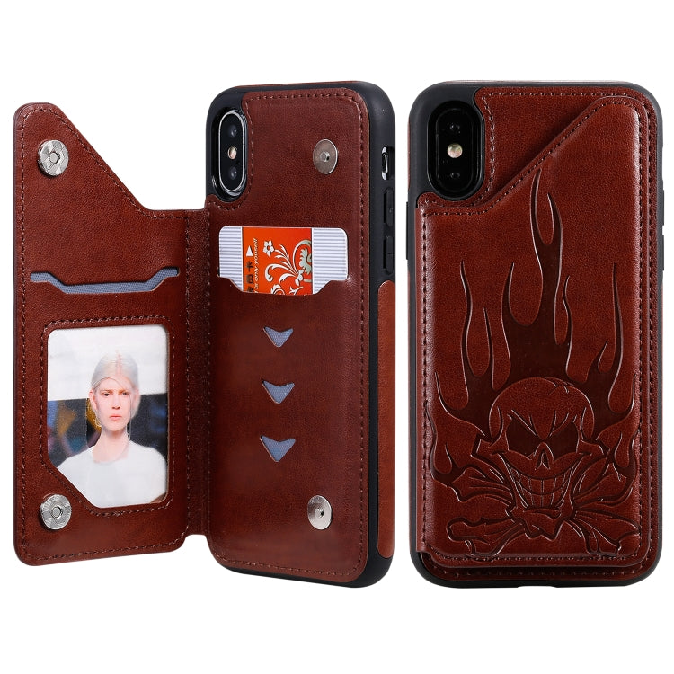 Estuche protector para iPhone Xs Max Skull Head con patrón en relieve, a prueba de golpes, soporte, ranuras para tarjetas y billetera (Marrón)