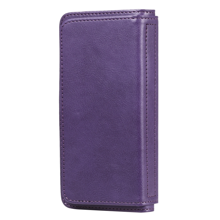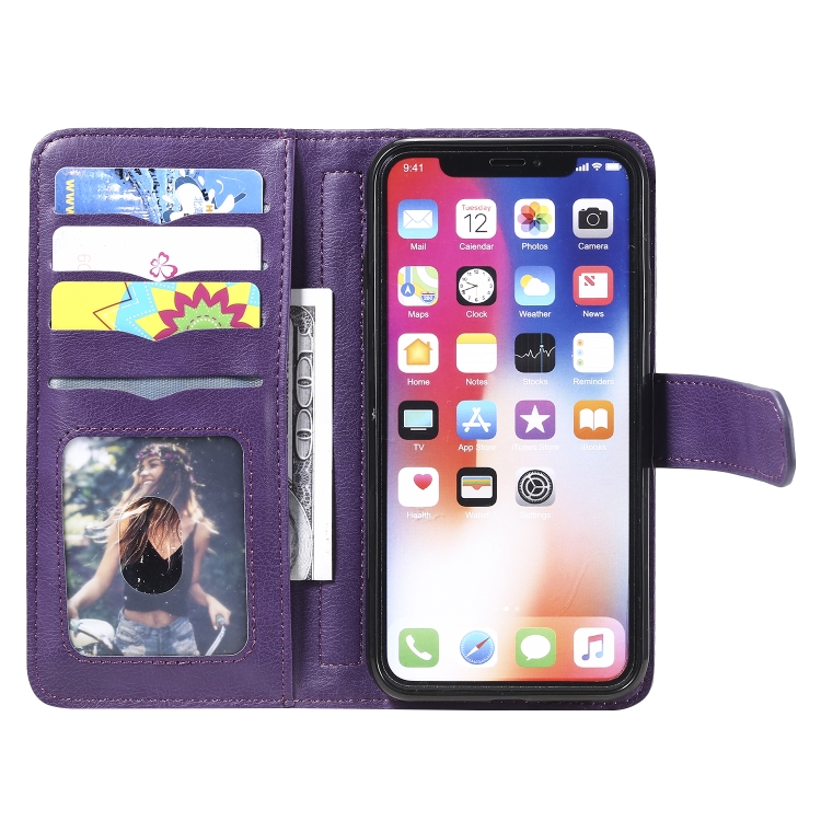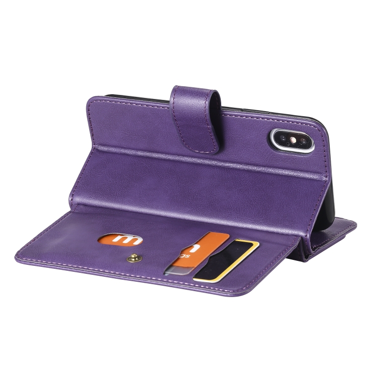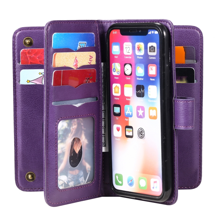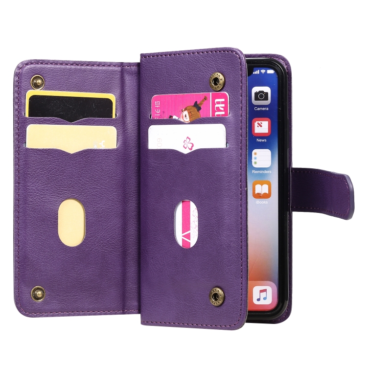 Estuche de Cuero para iPhone Xs / X con Hebilla Magnética Multifuncional, Tapa Horizontal, 10 Ranuras para Tarjetas, Billetera y Soporte (Púrpura)