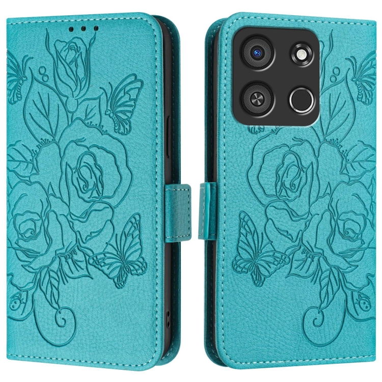 Estuche para Itel A05S de Cuero Antirrobo RFID con Rosa en Relieve (Azul Claro)