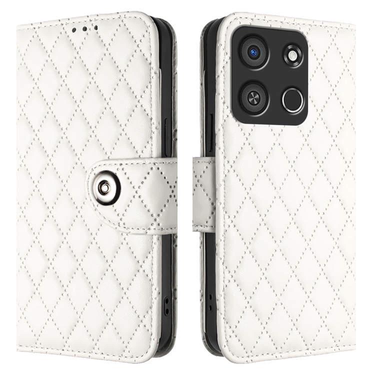 Funda para Teléfono Itel A05S de Cuero con Tapa, Textura Rómbica y Cordón (Blanco)