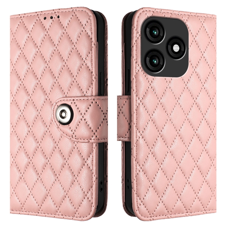 Funda para Teléfono Itel A70 con Tapa de Cuero Textura Rómbica y Cordón (Rosa Coral)