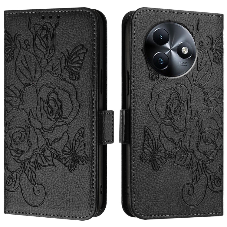 Estuche para Teléfono Itel S24 Cuero Antirrobo RFID con Rosa en Relieve (Negro)
