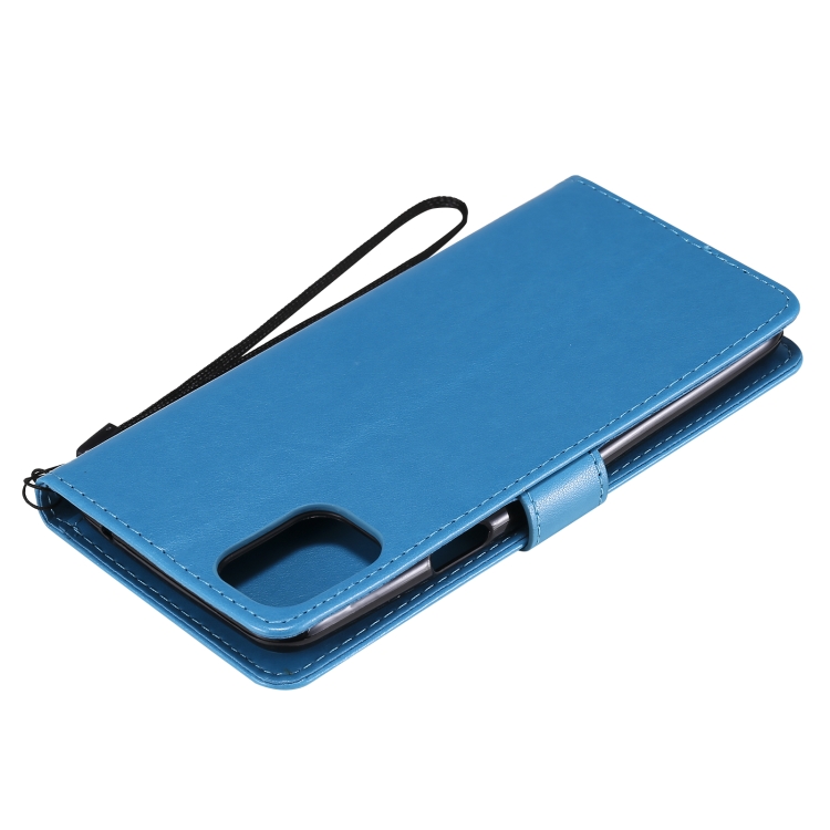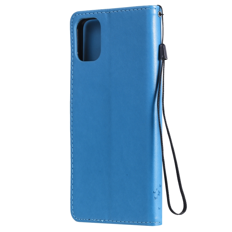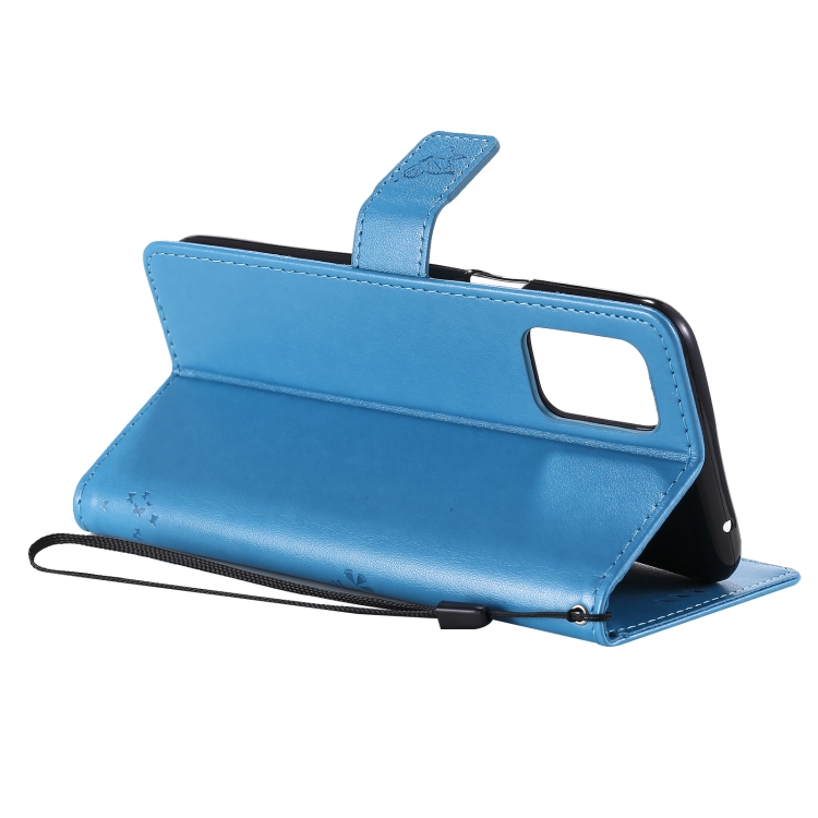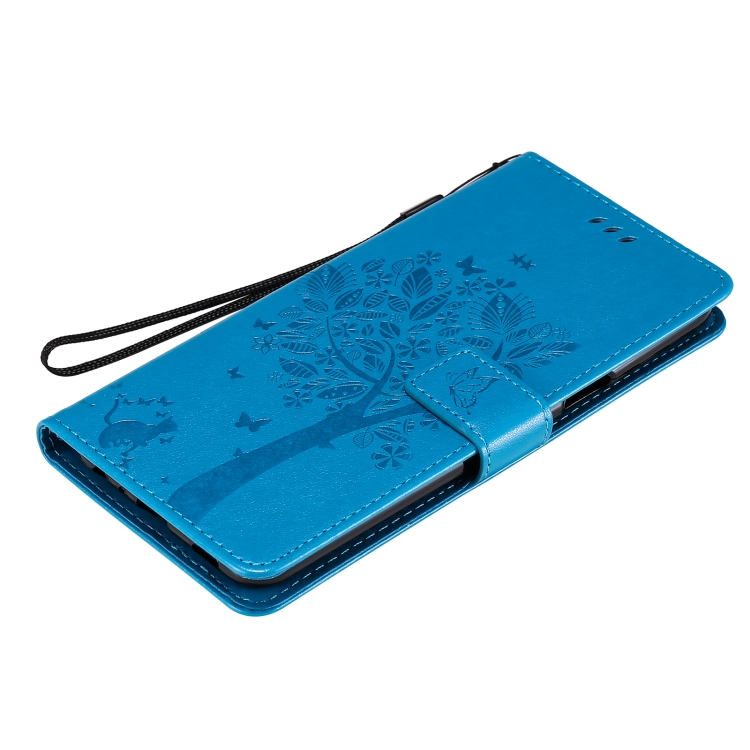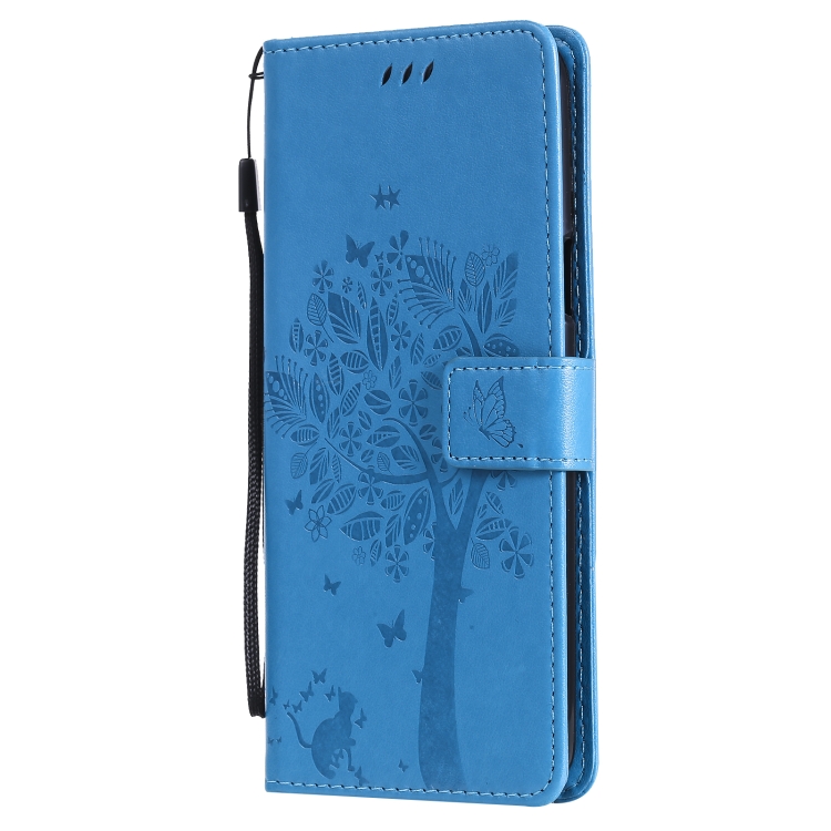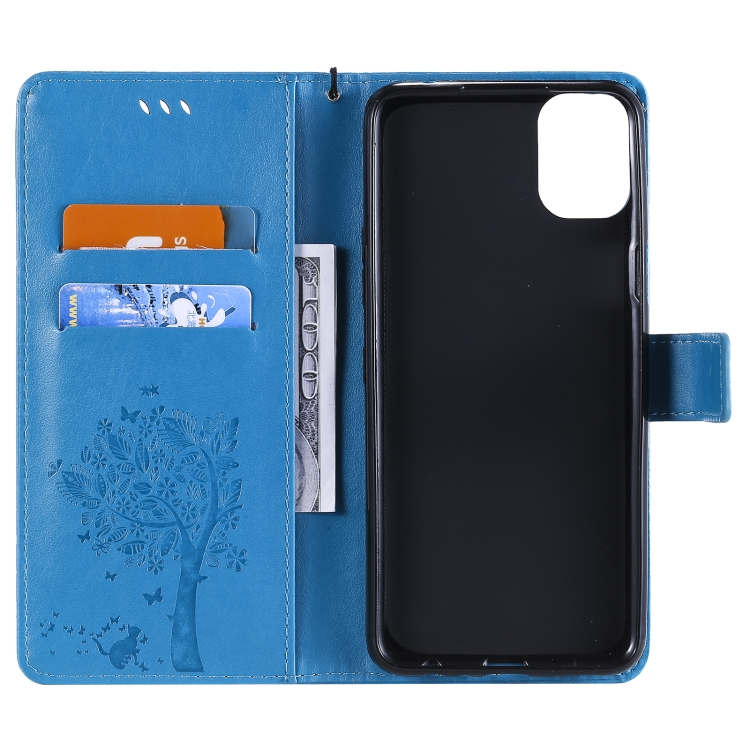 Funda para LG K42 con patrón Tree & CAT, cuero PU, soporte, ranuras para tarjetas y cordón (Azul)