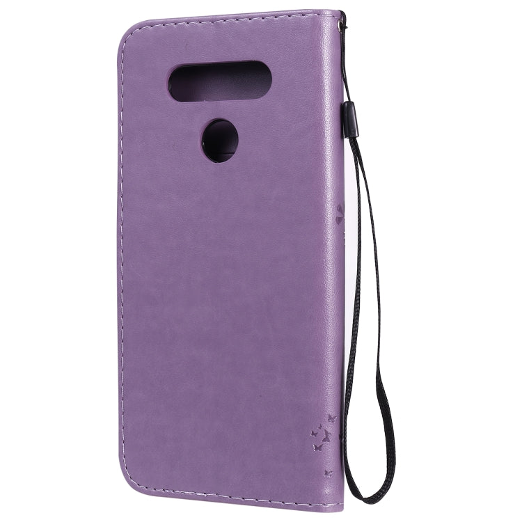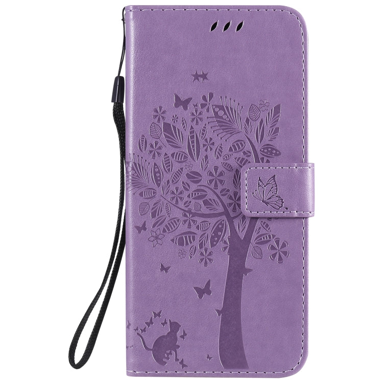 Funda de Cuero para LG K51 con Tapa Horizontal, Patrón Árbol y Gato, Soporte, Ranuras y Cordón (Morado Claro)