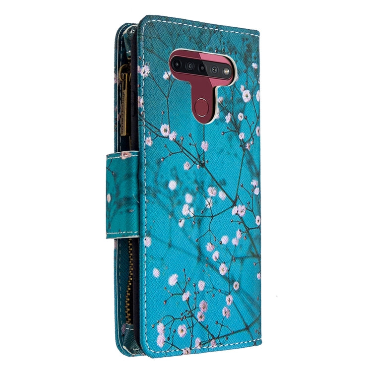 Funda de Cuero para LG K51 con Patrón de Dibujo, Cremallera, Soporte y Ranuras (Plum Blossom)