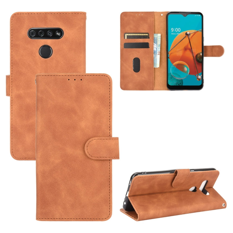 Estuche Cuero Sintético LG K51 Q51 con Hebilla Magnética, Soporte, Ranuras y Billetera (Marrón)