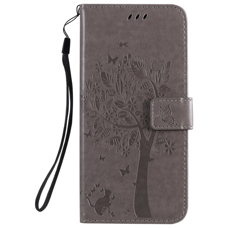 Funda de Cuero para LG K51 Tree & CAT con Tapa Horizontal, Soporte, Ranuras para Tarjetas, Billetera y Cordón (Gris)