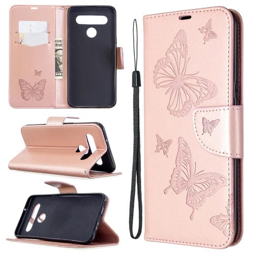 Funda de Cuero para LG K61 con Dos Mariposas en Relieve, Tapa Horizontal, Soporte, Ranura para Tarjeta y Billetera, Cordón (Dorado)