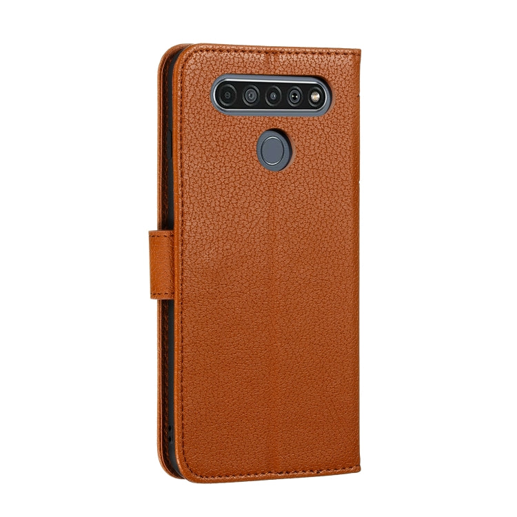 Funda de Cuero para LG K61 con Tapa Horizontal, Textura Litchi, Diseño Plumas, Billetera y Soporte (Marrón)
