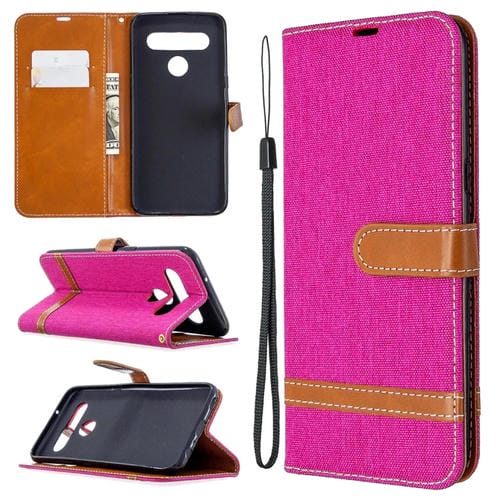 Funda de Cuero para LG K61 con Tapa Horizontal, Textura Mezclilla, Soporte, Ranuras y Cordón (Rosa Roja)
