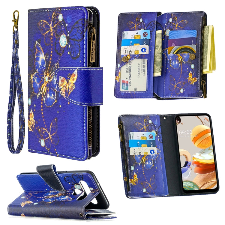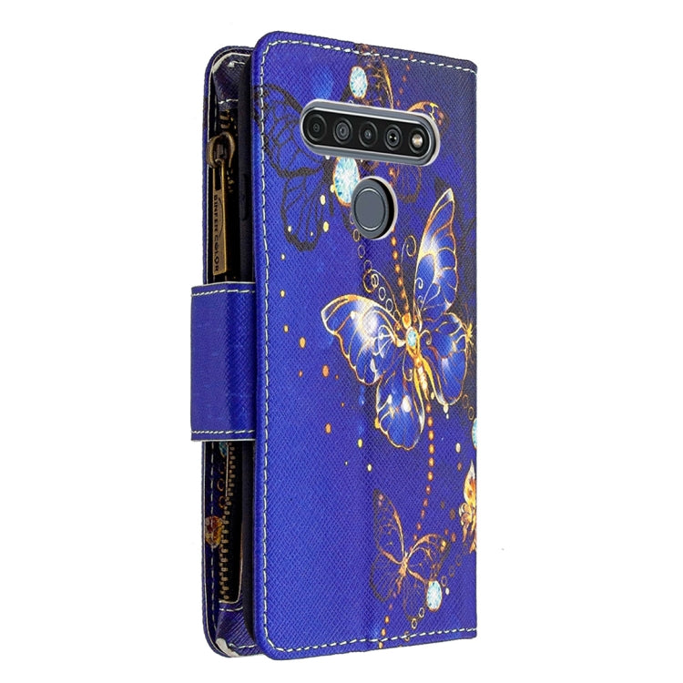 Funda de Cuero para LG K61 con Patrón de Dibujo, Cremallera, Tapa Horizontal, Soporte y Ranuras para Tarjetas (Mariposa Púrpura)