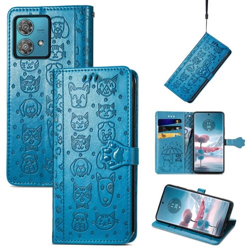 Funda para Motorola Edge 40 Neo de Cuero con Relieve de Perro y Gato (Azul)