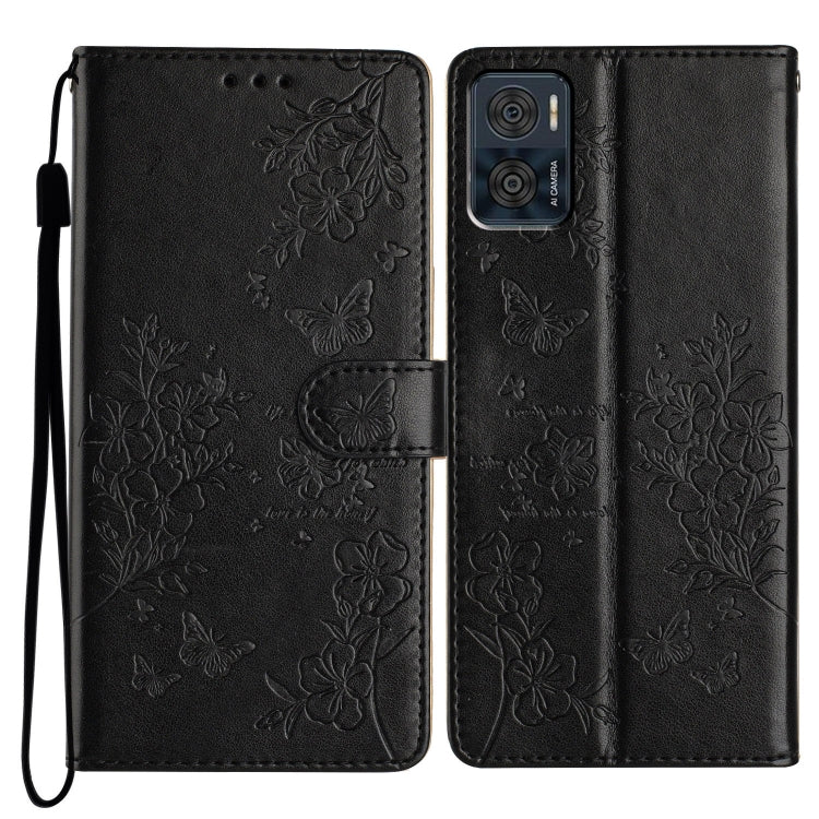 Funda de Cuero para Motorola Moto E22 con Mariposas y Flores (Negro)