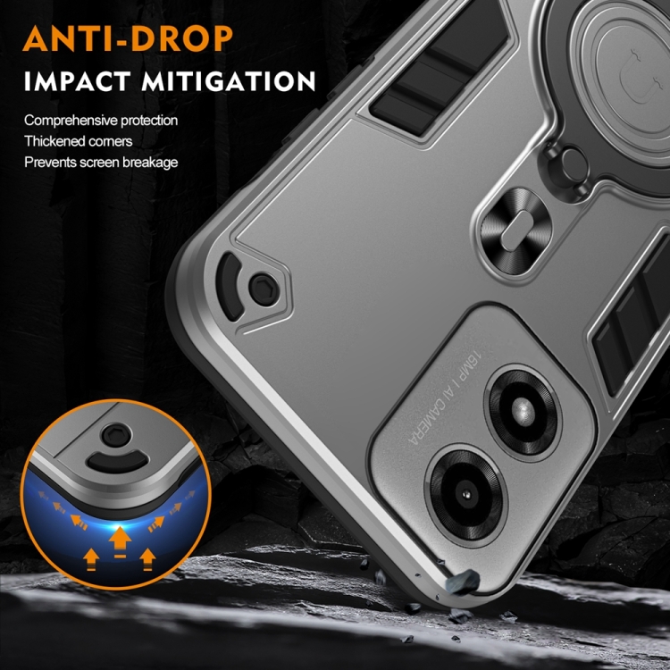 Estuche híbrido para Motorola Moto G04 y G24 con anillo de metal soporte giratorio 360 grados (Gris Plateado)