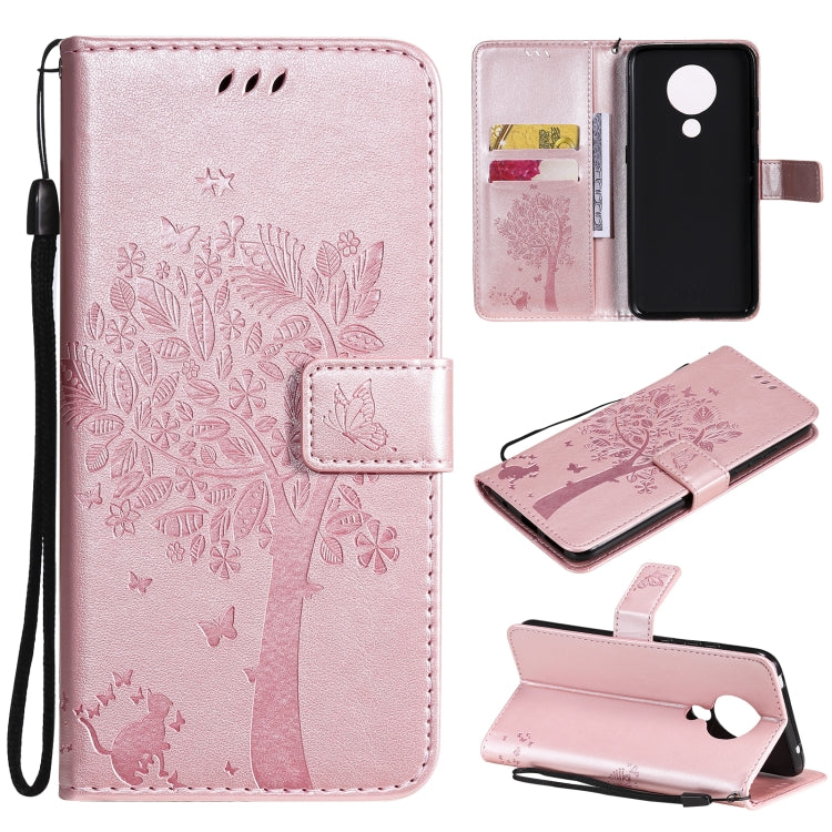 Para Nokia 5.3 Patrón de árbol y gato Impresión prensada Funda de cuero Horizontal Flip PU con soporte y ranuras para tarjetas y billetera y cordón (oro rosa)