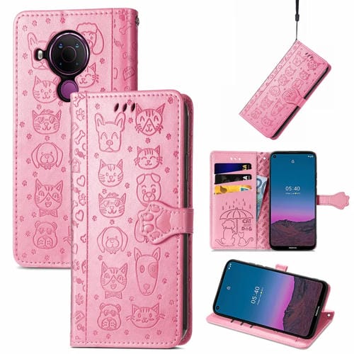 Funda para Nokia 5.4 con Estampado de Gato y Perros, Cuero Horizontal, Soporte, Ranuras y Cordón (Rosa)