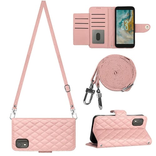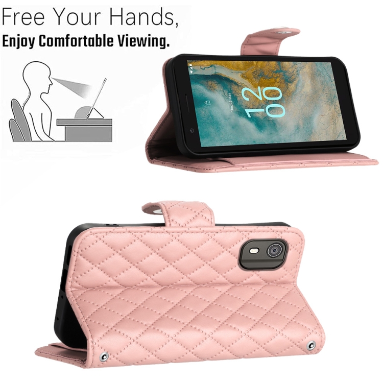 Funda de Cuero para Nokia C02 con Tapa, Textura Rómbica y Cordón Largo (Rosa Coral)