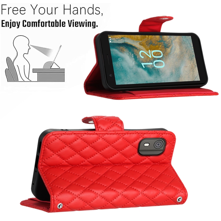 Funda para Nokia C02 de Cuero con Tapa, Textura Rómbica y Cordón Largo (Rojo)