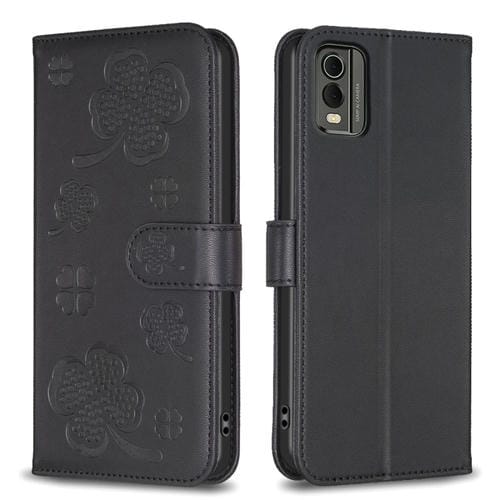 Funda de Cuero para Nokia C12 con Relieve de Cuatro Hojas (Negro)