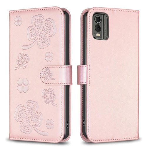 Funda de Cuero para Nokia C12 con Relieve de Cuatro Hojas (Rosa)