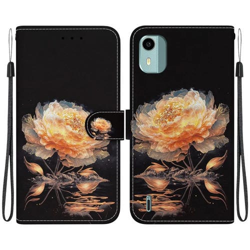 Funda de Cuero para Nokia C12 con Dibujo Coloreado y Textura de Cristal (Peonía Dorada)