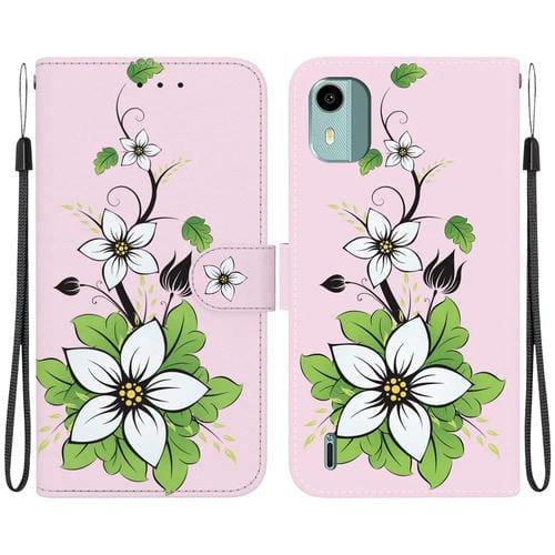 Funda para Teléfono Nokia C12 de Cuero con Dibujo Coloreado y Textura de Cristal (Lirio)