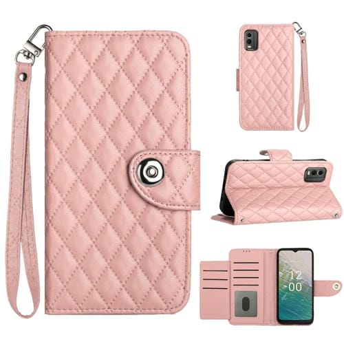 Funda de Cuero para Nokia C32 con Tapa Textura Rómbica y Cordón (Rosa Coral)