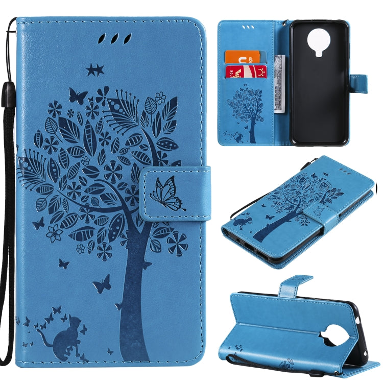 Para Nokia G10 Árbol y gato Patrón de impresión prensado Funda de cuero PU de la PU con soporte y tragamonedas y billetera y cordón (azul)