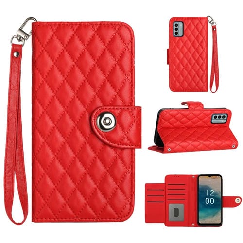 Funda de Cuero para Nokia G22 con Tapa, Textura Rómbica y Cordón (Rojo)
