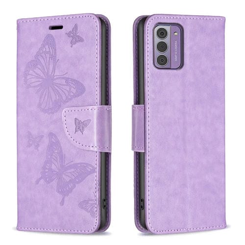 Funda de Cuero PU para Nokia G42/G310 con Tapa Horizontal Estampado Dos Mariposas (Púrpura)