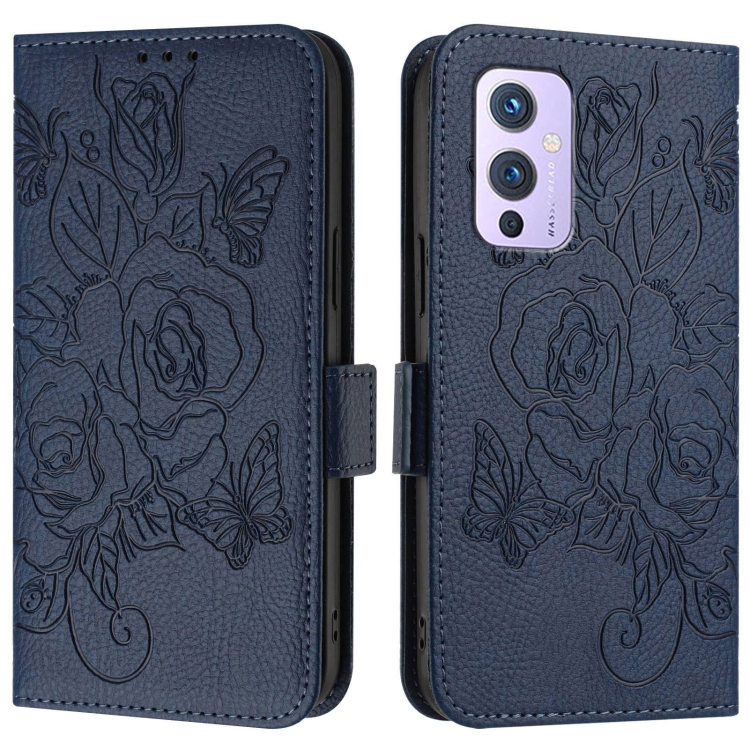 Funda de Cuero Antirrobo RFID para OnePlus 9 con Relieve Rosa (Azul Oscuro)