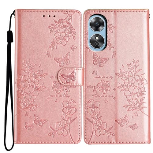 Para Oppo A17 Funda de Teléfono de Cuero con Relieve de Flor de Amor de Mariposa (Oro Rosa)