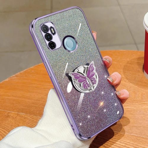 Para Oppo A32 Funda para Teléfono de TPU con Soporte de Mariposa con Brillo Degradado Plateado (Púrpura)
