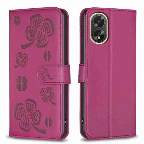 Para Oppo A38 / A18 4G Funda de Cuero con Relieve de Cuatro Hojas para Teléfono (Rojo Rosa)