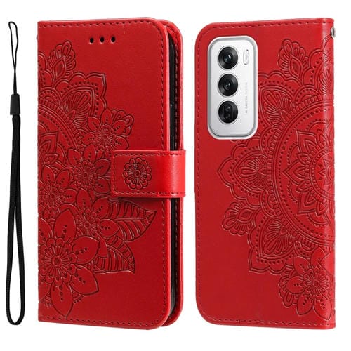Para Oppo Reno12 5G Global Funda para Teléfono de Cuero con Estampado de Flores de Siete Pétalos (Rojo)