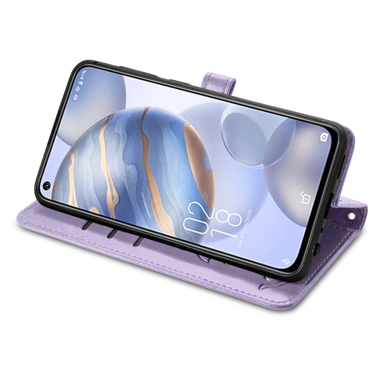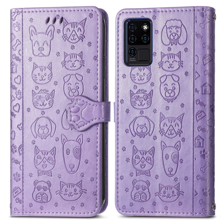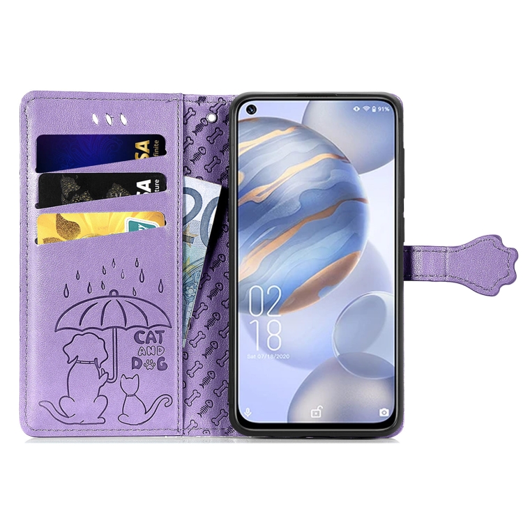Funda de Cuero para Oukitel C21 con Soporte, Ranuras para Tarjetas y Estampado de Gato y Perro (Púrpura)
