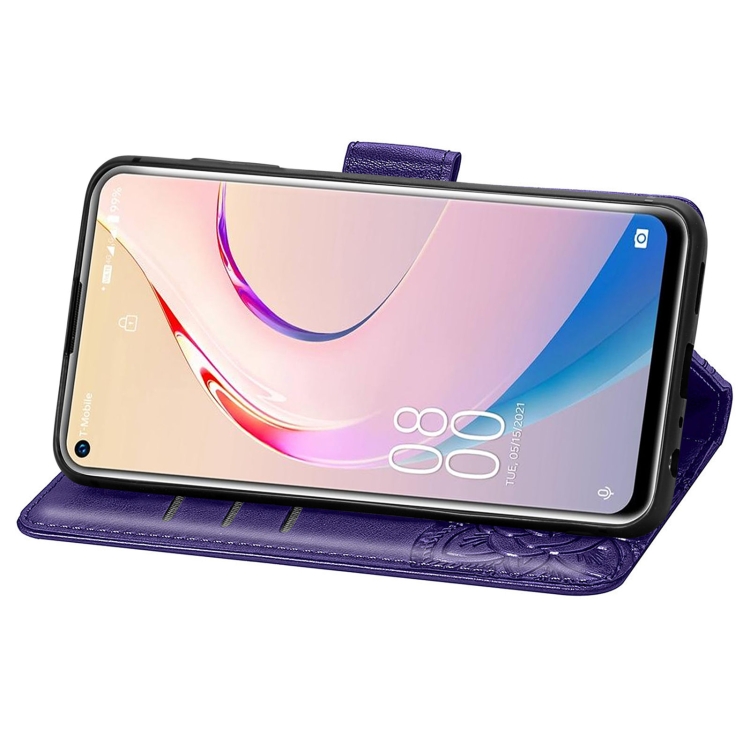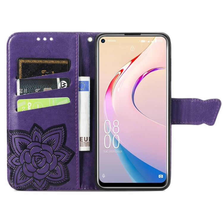 Funda de Cuero para Oukitel C21 Pro Butterfly Love Flower con Soporte, Ranuras y Cordón (Morado Oscuro)