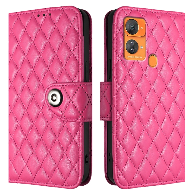 Funda para Oukitel C33 de Cuero con Tapa Textura Rómbica y Cordón (Rojo Rosa)