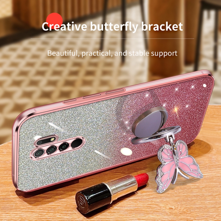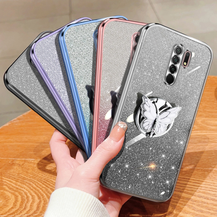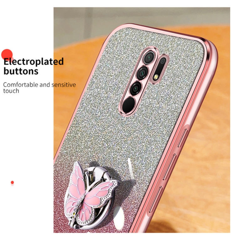 Para Redmi 9 Funda para Teléfono de TPU con Soporte de Mariposa con Brillo Degradado Plateado (Púrpura)