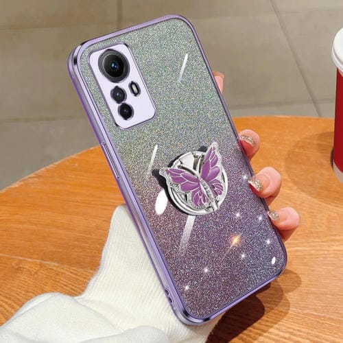 Para Redmi Note 12S Funda para Teléfono de TPU con Soporte de Mariposa con Brillo Degradado Plateado (Púrpura)