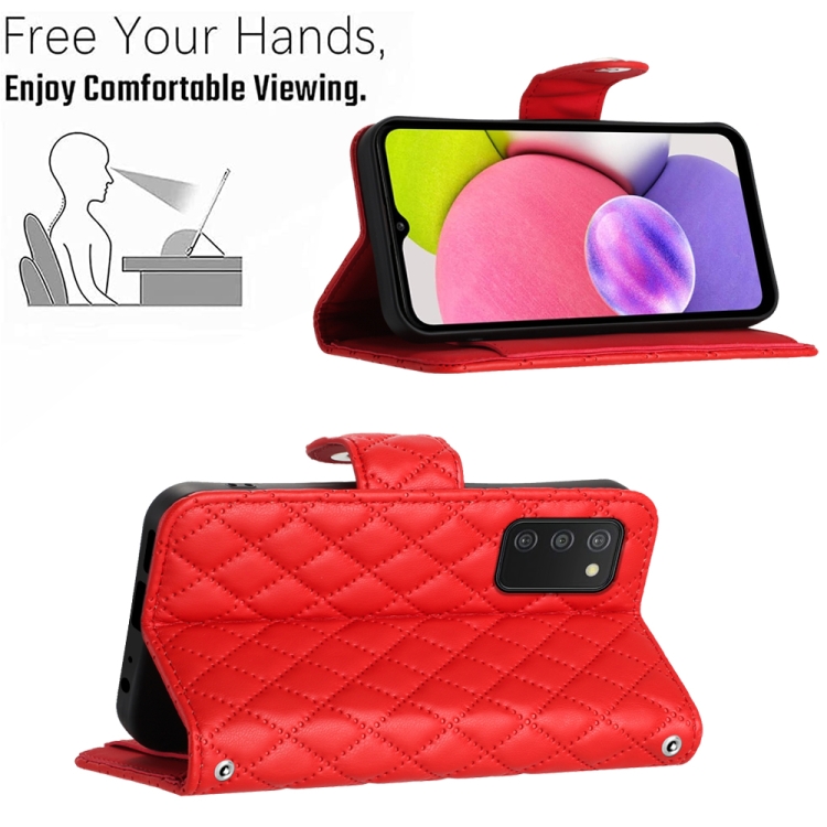 Funda de Cuero para Samsung Galaxy A03S Eu con Tapa Textura Rómbica y Cordón Largo (Rojo)