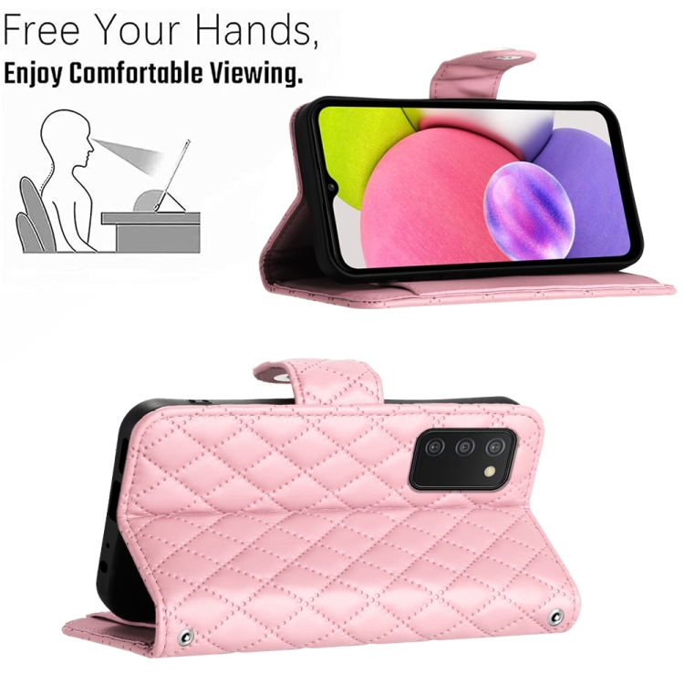 Funda de Cuero para Samsung Galaxy A03S Eu con Tapa Textura Rómbica y Cordón Largo (Rosa)