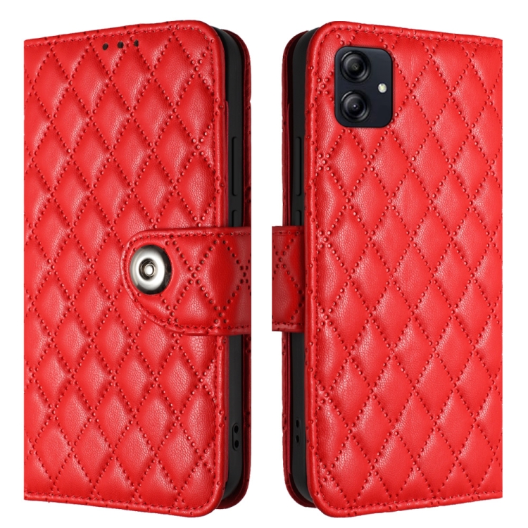 Funda para Teléfono Samsung Galaxy A04E con Tapa de Cuero Textura Rómbica y Cordón (Rojo)