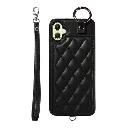 Estuche para Teléfono Samsung Galaxy A05 con Bolsa para Tarjetas Textura Rómbica y Cordón Corto (Negro)