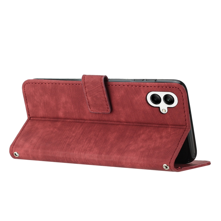 Funda de Cuero Samsung Galaxy A05 Skin Feel con Patrón de Rayas y Cordón (Rojo)