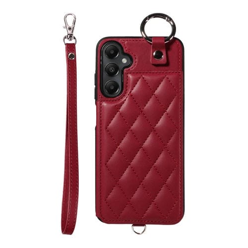 Estuche para Teléfono Samsung Galaxy A05S con Bolsa para Tarjetas Textura Rómbica y Cordón Corto (Rojo Vino)