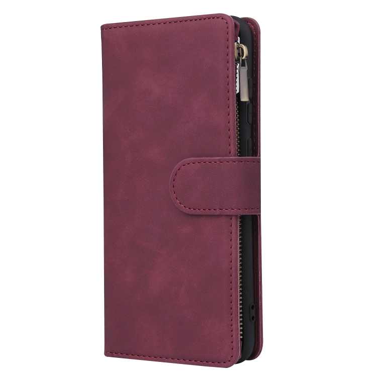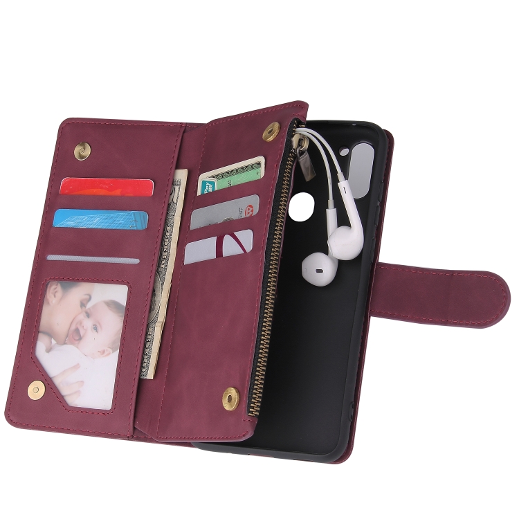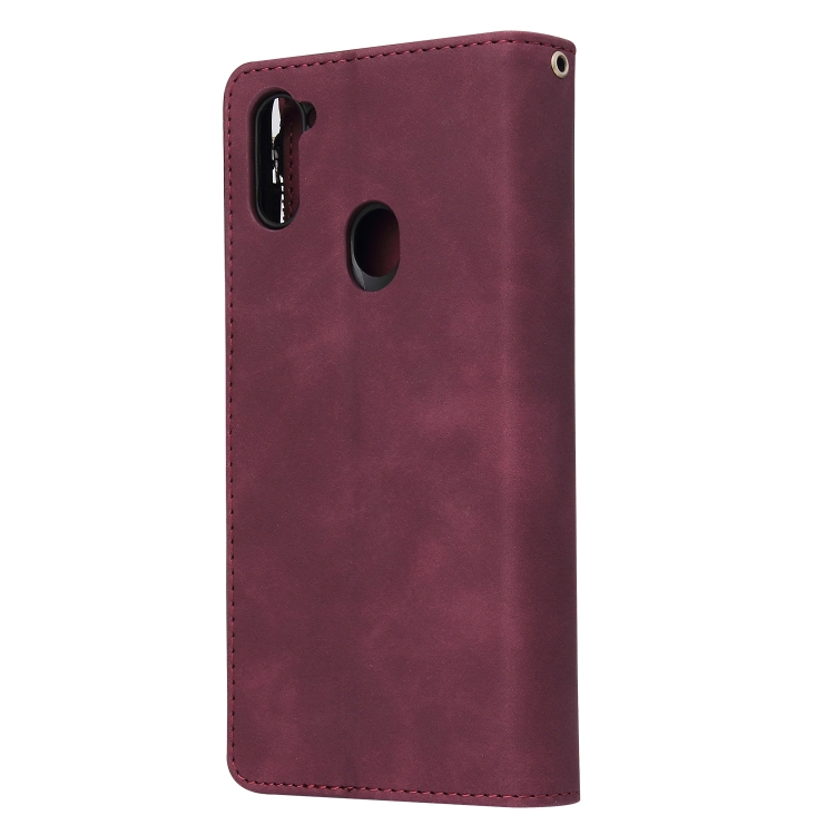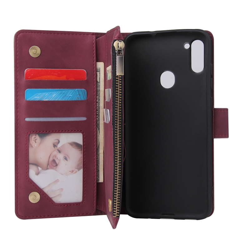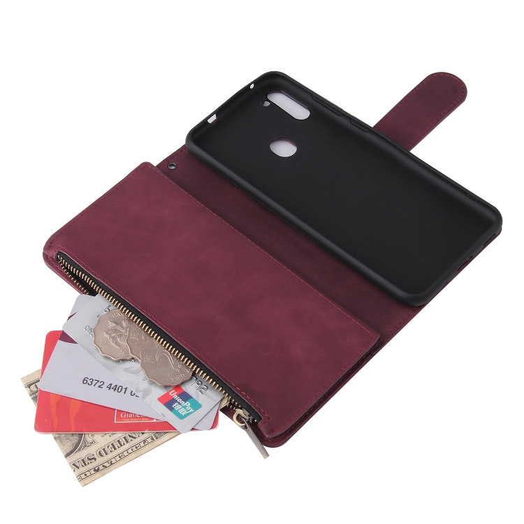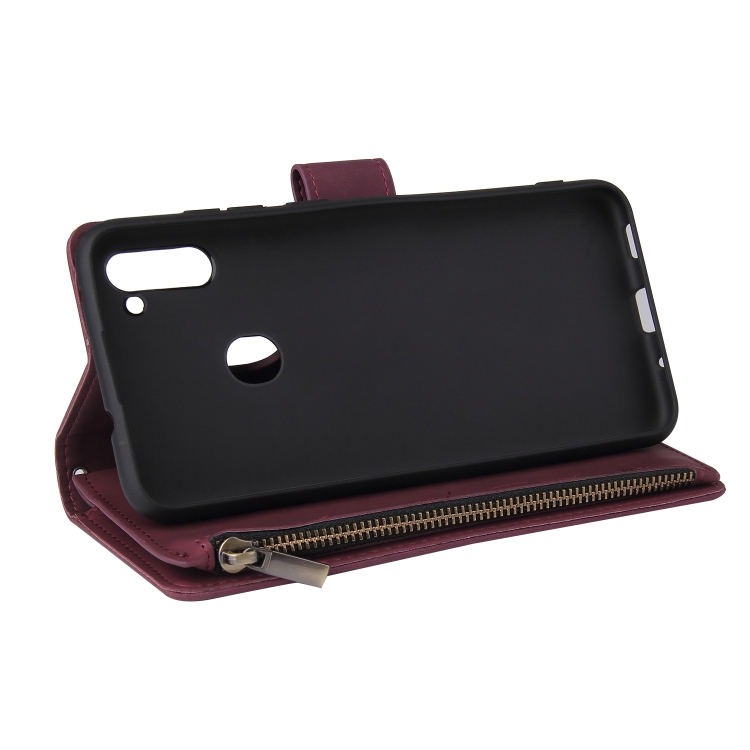 Estuche para Teléfono Samsung Galaxy A11 Cuero con Billetera y Cremallera Multifuncional (Rojo Vino)